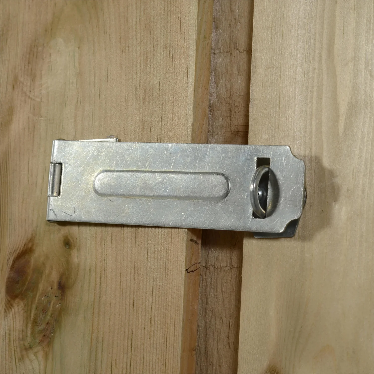 The double doors are braced with double ‘Z’ framing for added strength and feature hidden hinges for increased security. The hasp and plate door fastening can be secured with a padlock (not included.)
