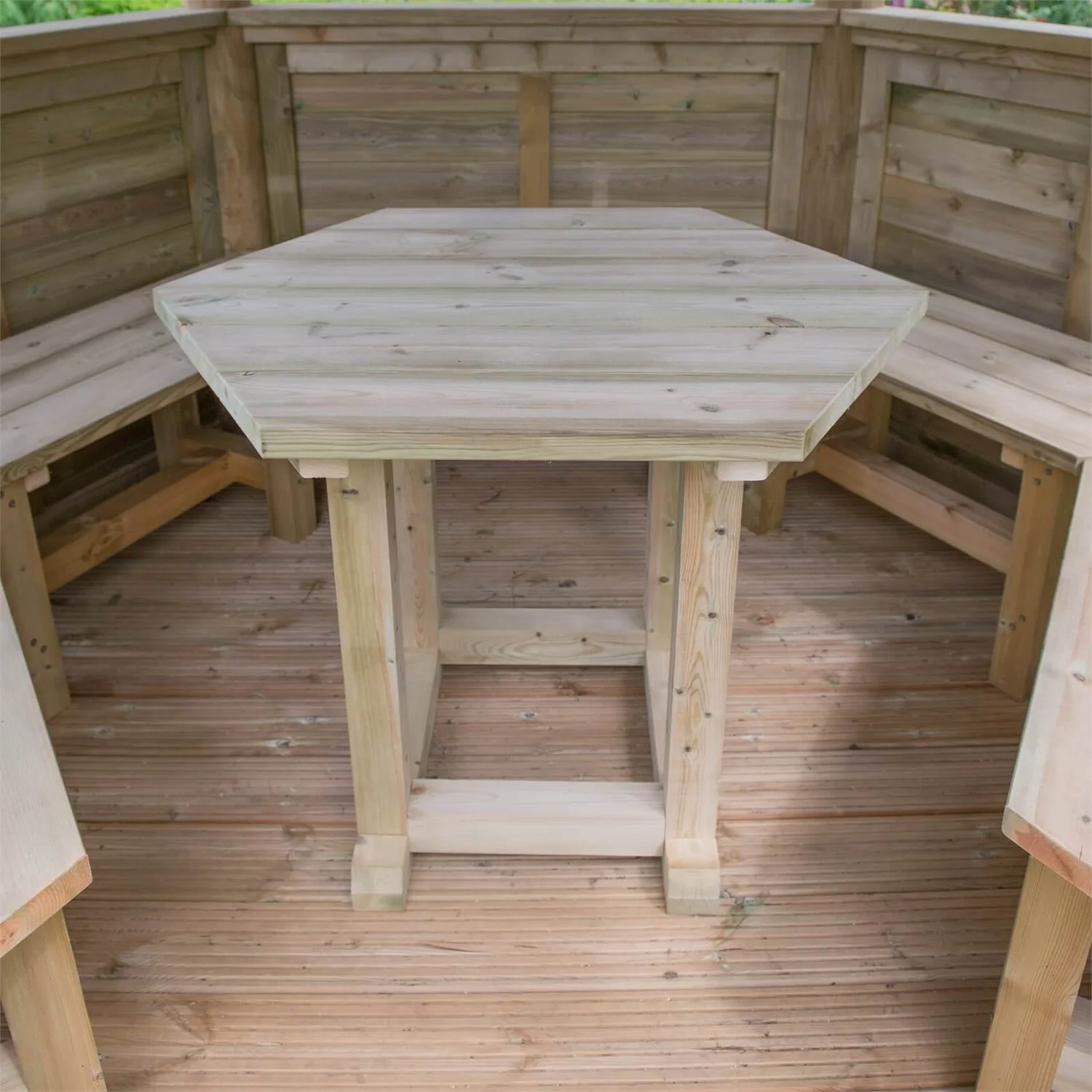 - Includes a hexagonal table and set of 5 matching bench seats that can accommodate up to 10 adults or 14 children