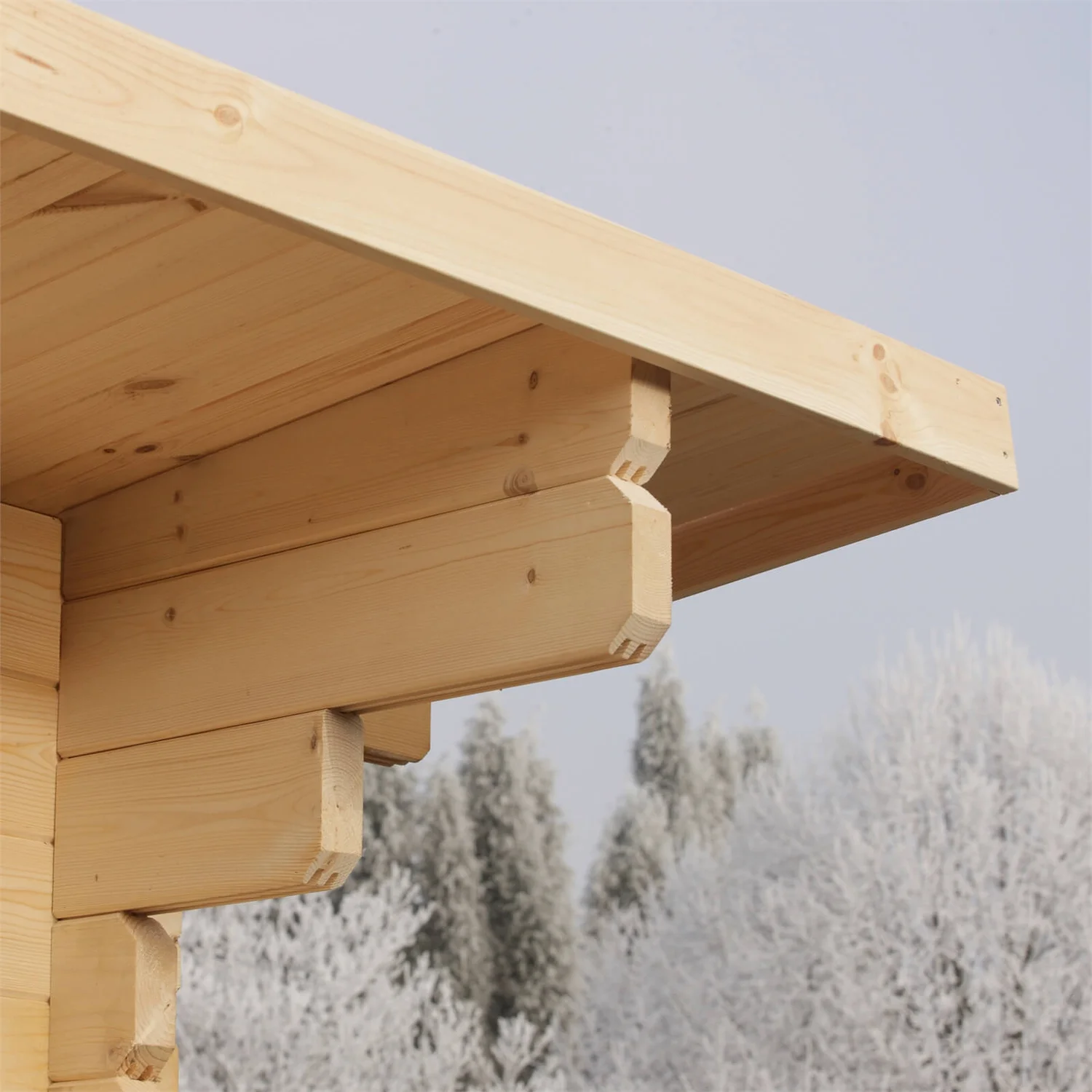 The Mendip’s overall dimensions are 5.24 metres wide x 4.66 metres deep (17 x 15 feet) and the front of the roof features a useful 60cm overhang for weather protection. The internal floor dimensions of 4.7m x 3.7m give a total floor area of 17.5 m (188 square feet) which is big enough to have a generous home office and lounge or lounge and dining area or a great leisure room for gaming, TV and hobbies. With plenty of windows to allow natural light in this makes the Mendip log cabin a very usable and versatile extension to your living space. The internal depth of 3.7m and width of 4.7m give lots of wall space for shelving, cupboards or other furniture.