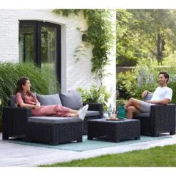 The California balcony set is made of more than 83% recycled resin with a 6mm round wicker design. The woven wicker style creates a luxurious and trendy look and can create a focal point in any outdoor space. The set consists of two wide lounge chairs, and square coffee table which is perfect two for hosting in indoor conservatory’s, or outdoors in gardens and patio areas. The cushions included are 7.5 cm thick and provide optimal seating comfort to relax and unwind. Lightweight in its structure therefore is easier to move to suit any setting and is easy and quick to assemble. The garden set is completely maintenance-free and weather-resistant, so you can enjoy the lounge set for years to come.