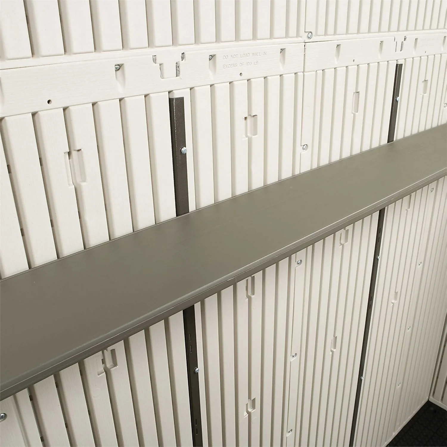 The 10-foot wide sheds from Lifetime products give you that extra space needed while accenting the beauty of your backyard. The centralized location of the doors provides easy storage access and the decorative shutters, moulded wood-grain panels, and simulated shingled roof ensure an attractive design that will be the envy of your neighbourhood.