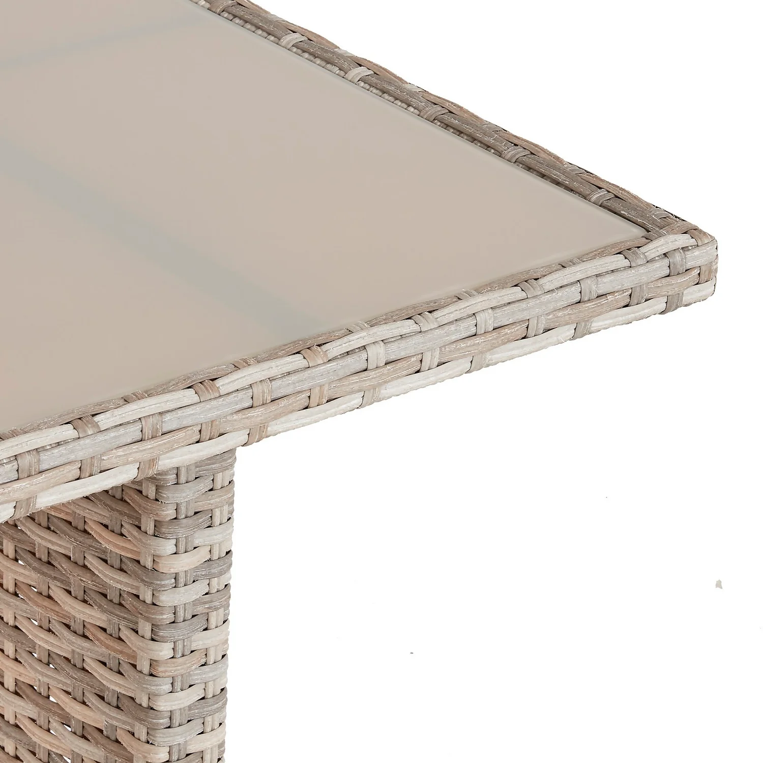 Perfect for entertaining guests outdoors on warm sunny days, this contemporary Matara rattan effect garden corner sofa set will add a modern feel to any garden or patio. Comprising of sofa, L-shaped sofa, table, two cushioned footstools and both seat and back cushions, this versatile dining set can be quickly transformed from a dining set into a lounge set. Ideal for both indoor and outdoor use, this stylish dining set is constructed with powder-coated steel frame and hand woven synthetic rattan.