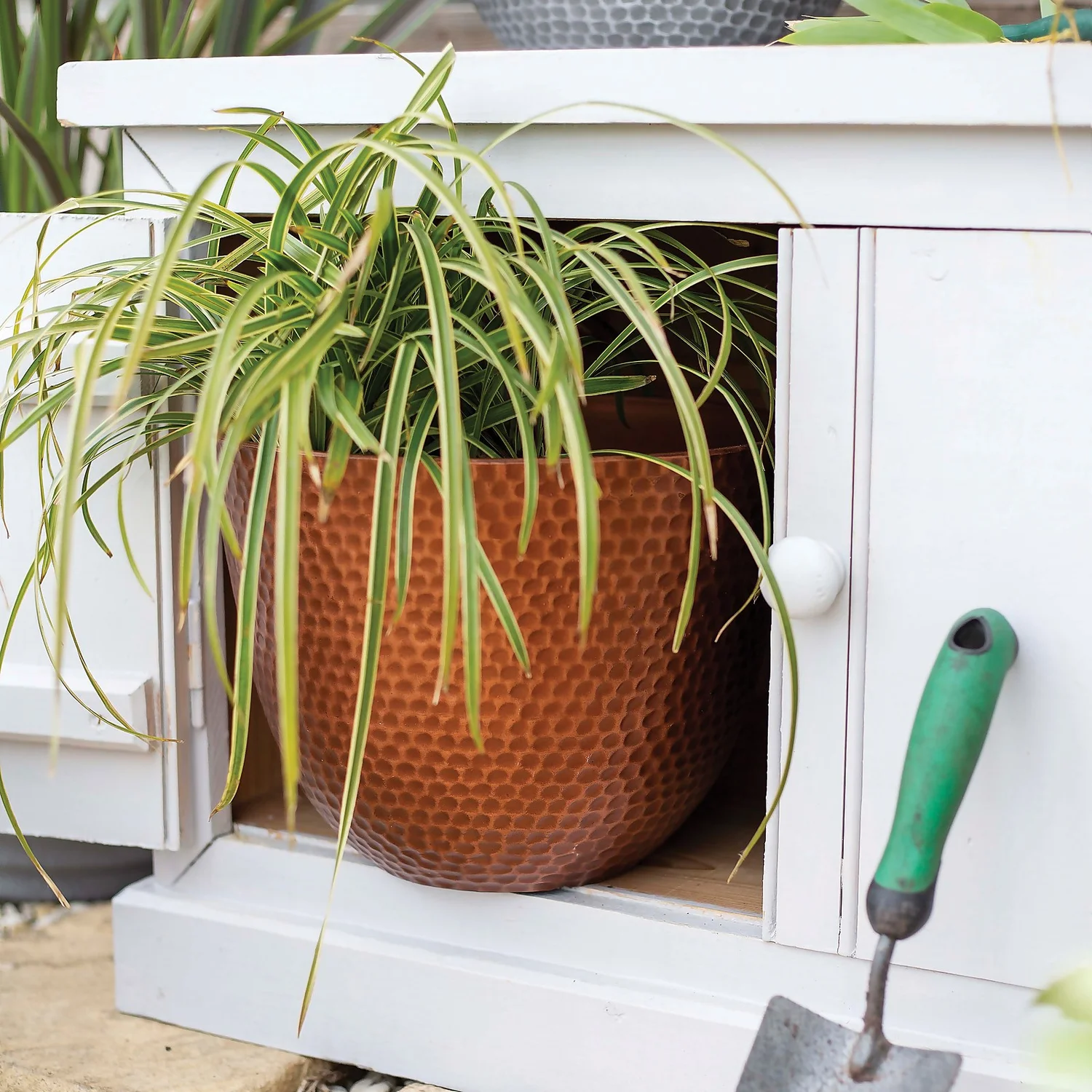 The Suva pot with its hammered texture is a contemporary styled planter in metallic colours. Lightweight and made from recycled plastic, these stunning planters are perfect to add a bit of bold colour to your garden.